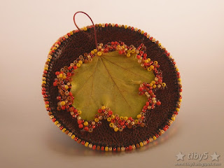 Jest to listek klonu zabezpieczony przed kruszeniem, obsypany mieszanką kolorów pozostałą po ostatniej szydełkowej pracy , podstawę stanowi ekologiczna skóra.